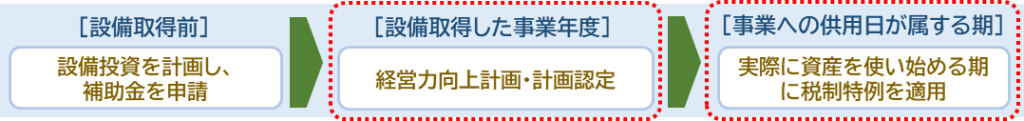 | ①工業会証明書または経産局確認書の取得 →添付して経営力向上計画を申請 ②認定後に設備取得(原則) →供用事業年度の申告時に優遇申請 |