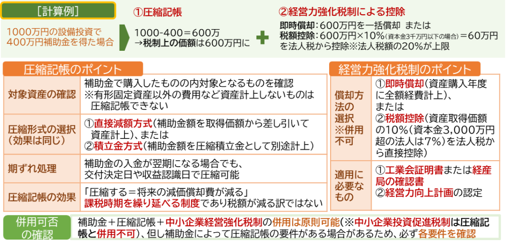 補助金で取得した資産は原則圧縮記帳できるだけでなく、その圧縮後の取得価額に対して中小企業経営強化税制(経営力向上計画)の即時償却または税額控除が原則併用できます。補助金施策の総仕上げとして「補助金→圧縮→税制」の適切な順序を確認し、キャッシュ確保&納税最適化を完成させましょう。