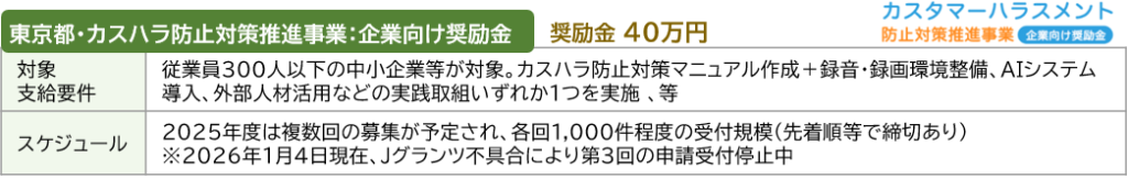 法制化に先駆け、東京都ではカスハラ防止の条例が2025年4月1日に施行され、都内企業向けには奨励金や企業支援事業(セミナー等)が案内されています。