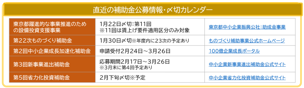 各補助金は2026年2~3月頃からスタートし、年に2~3回(省力化補助金は3~4回)の実施が想定されます。また同時に、都道府県単位の補助金情報も徐々に発表されていきます。 2026年は基本2025年を踏襲していますが、2027以降はわからないため、使えそうな施策は今年で使った方がよいといえるでしょう。